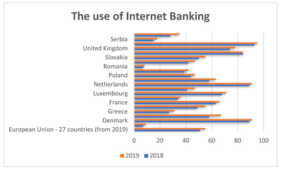 Comparison of the use of internet banking based on DESI indicators in European countries in 2018 and 2019. Source: Authors’ sketching based Digital Economy and Society Index, Eurostat, Internet: https://ec.europa.eu/digital-single-market/en/desi (accessed on 21 February 2020).