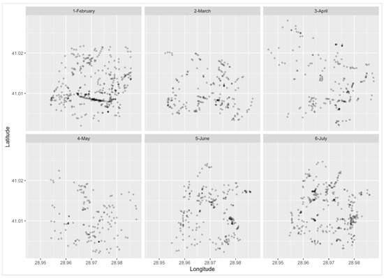 In the study, we calculated smoothed values of the mobile users’ address queries with R. We represented raw data points with the coordinates limited to the historical peninsula of Istanbul, as shown in Figure 1. The darkest points are centered on the place of the highest density of address queries. For example, in February, the darkest points contain approximately 70% of all queries performed during the month. For all months, most concentric regions include 80% of the cases. To investigate how the observations are related to each other and estimate differences of the densities before and during the COVID-19 pandemic, we show the point coordinates of address queries by months. In February 2020, before the announcement of the first confirmed case of COVID-19 in Turkey, it can be concluded that mobile user address queries were more densely located in tourist spots and historical places. There was a decrease in the density of the queries in the next few months and the lowest density occurred in May.