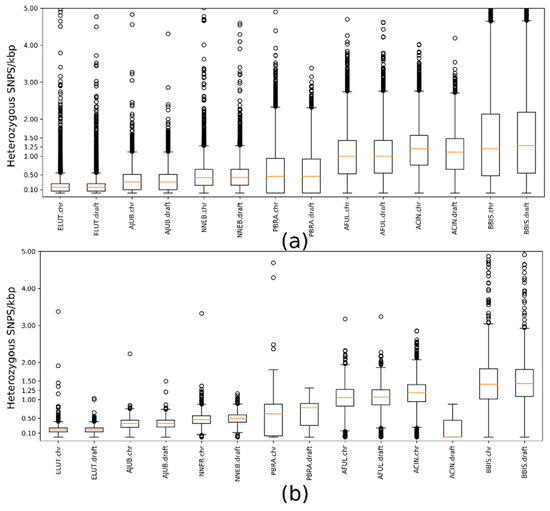 Comparison of distribution of mean heterozygosity in windows of 100 kb (a) and 1 Mbp (b) for draft and chromosome level assemblies.