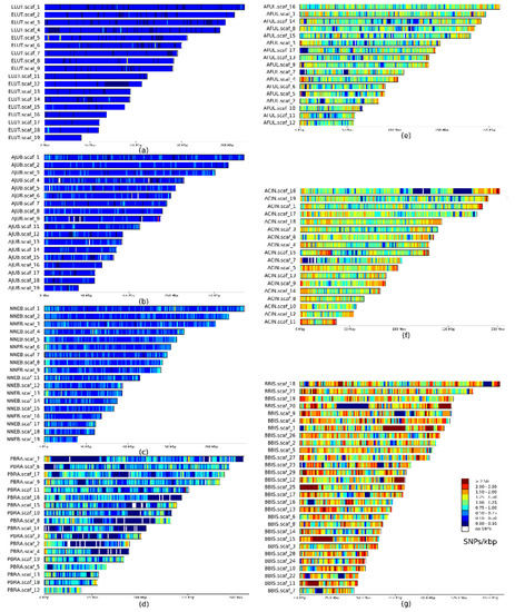Heatmaps of heterozygous SNP densities for analyzed species based on chromosome-level assemblies (sex chromosomes were excluded). Heterozygous SNPs were counted in 1 Mbp windows and scaled to SNP/kbp. (a)—sea otter, (b)—cheetah, (c)—clouded leopard, (d)—giant otter, (e)—red panda, (f)—Asian small-clawed otter, (g)—American bison.