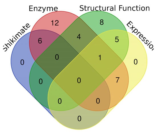 A Venn diagram of the 5-enolpyruvylshikimate 3-phosphate synthase (EPSPS)-associated domains. Blue is shikimate pathway, red is enzymes, green is structural function and yellow is gene expression. The diagram was made with the following tool: http://bioinformatics.psb.ugent.be/webtools/Venn/ (accessed on 1 October 2019).