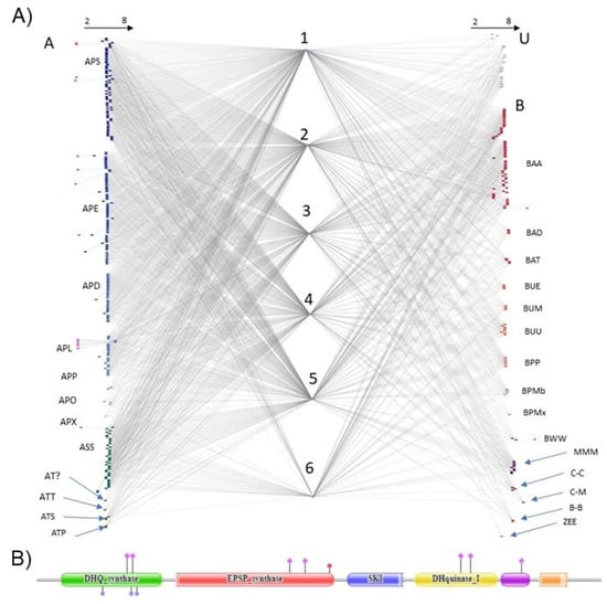 A bipartite network of fungal species and EPSPS-associated domains. (A) A bipartite network of fungal samples. Letters stands for different phyla and classes of fungi. On the left side there are fungi of the phylum Ascomycota (A) and on the right side there are fungi of the phyla Basidiomycota (B) Mucoromycota (M), Chytridiomycota (C), Blastocladiomycota (Bl) and Zoopagomygota (Z) and unknown taxa (U). Numbers correspond to fungal multi-domain: (1) DH synthase, (2) EPSP synthase, (3) SKI, (4) DH quinase type 1, (5) shikimate dh N and (6) shikimate DH. Arrows on the top of the figure note the number of domains in the multi-domain, which ranges between 2 to 8 domains. Subphyla and classes starting from the upper left are Pezizomycotina: Sordariomycetes (APS), Eurotiomycetes (APE), Dothideomycetes (APD), Leotiomycetes (APL), Pezizomycetes (APP), Orbiliomycetes (APO) and Xylonomycetes (APX); Saccharomycotina: Saccharomycetes (ASS); Taphrinomycotina: incertae sedis (AT?), Taphrinomycetes (ATT), Schizosaccharomycetes (ATS) and Pneumocystidomycetes (ATP); Agariomycotiina: Agaricomycetes (BAA), Dacrymycetes (BAD) and Tremellomycetes (BAT); Ustilaginomycotina: Exobasidiomycetes (BUE), Malasseziomycetes (BUM) and Ustilaginomycetes (BUU); Pucciniomycotina: Pucciniomycetes (BPP), Microbotryomycetes (BPMb) and Mixiomycetes (BPMx); Wallemiomycotina: Wallemiomycetes (BWW); Mucoromycotina: Mucoromycetes (MMM); Chytridiomycota: Chytridiomycetes (C-C) and Monoblepharidomycetes (C-M); Blastocladiomycota: Blastocladiomycetes (B-B); Entomophthoromycotina: Entomophthoromycetes (ZEE). A detailed analysis of the bipartite network can be found in Appendix III. (B) Example of a multi-domain EPSPS protein of 1616 amino acids (protein A0A060S9A7_PYCCI from Pycnoporus cinnabarinus). In this example, the SKI and shikimate DH are fractured.