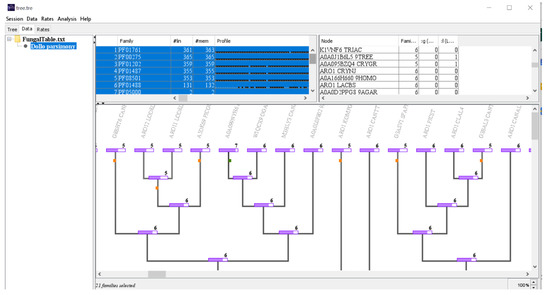 Screenshot of the output of the program Count [19]. The image shows a part of phylogenetic tree (center); domain family profile (top left) and node information (top right). The multi-domain structure of EPSPS in fungi is ancestral (6 domains) and there are recent domain gains and losses.
