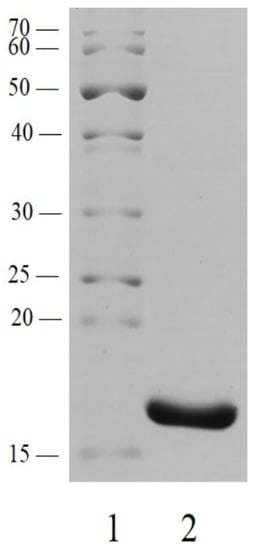 5]. Standard solution of a mixture of marker proteins with a known molecular weight “PageRuler Unstained Protein Ladder” manufactured by “Thermo Fischer Scientific” (Waltham, MA, USA) and 10 μL of the test solution (protein) at a concentration of 50 μg/μL was applied to the appropriate cells and added to the next well.