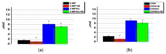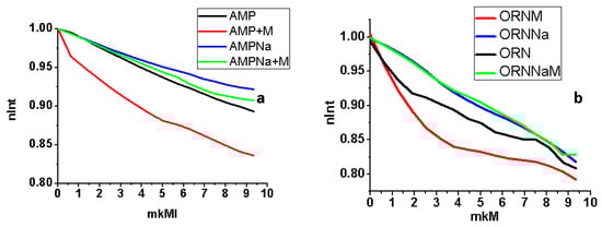 It is shown that when using ORNs and ORNs:D-M, quenching of the fluorescent INF was 18% and 21%, while for AMP and AMP:DM, it was 12% and 16%. Quenching of INF fluorescence in the titration of ORNssNa and ORNssNa:DM was 16% and 17%, while for AMPNa and AMPNa:DM, it was 8% and 10% (