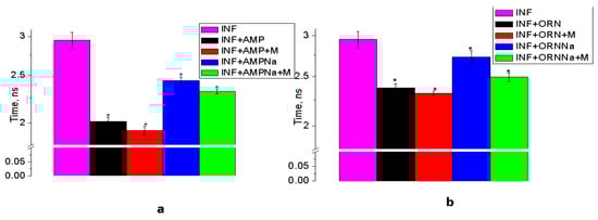 Figure 4). When interacting with ORNs and ORNs:D-M, INF has a fluorescence time of 2.37 and 2.32 ns, respectively, and when interacting with AMP and AMP: D-M, its fluorescence time is 2.01 and 1.92 ns. When interacting with ORNsNa and ORNsNa:D-M, INF has a fluorescence time of 2.73 and 2.49 ns, respectively, and when interacting with AMPNa and AMPNa: D-M, it has a fluorescence time of 2.31 and 2.43 ns.