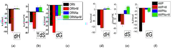 Figure 5d). The change in entropy when adding the ORNs to interferon α-2b was −31.12, and in the case of AMP:D-M, it was −43.31 kJ/mol*K, respectively. The change in entropy when adding AMP Na to interferon α-2b was 15.9 kJ/mol*K, and for the AMPNa:D-M, respectively, it was 30.71 kJ/mol*K (