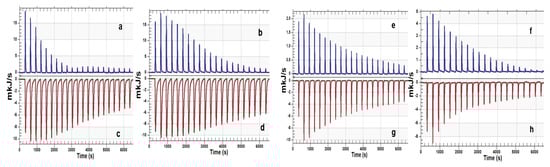 The energy parameters of the ligand–protein interaction was determined by isothermal titrating nanocalorimetry. The number of injections was 25, and the interval between injections was 300 s. The protein was pre-dialyzed against the buffer. There was a buffer in the comparison cell. We performed isothermal titration nanocalorimetry according to the method presented in [