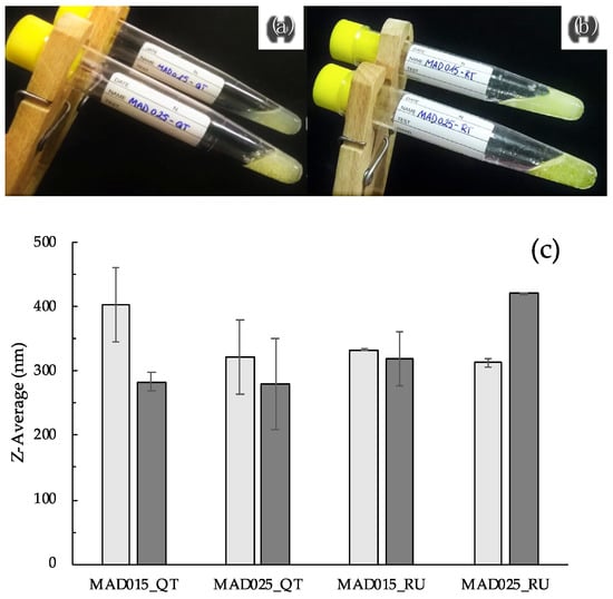 After production, the macrosopic aspect of QT and RU containing MAD appears translucent, as shown Figure 1. Particularly, both QT and RU confer a yellow color to the dispersion, more brilliant in case of RU, with no appreciable differences releated to the loaded drug. Conversely, the concentration of sodium cholate in the formulation influences the viscosity of the dispersion. Indeed, the higher the percentage of surfactant the higher the viscorsity of the system.