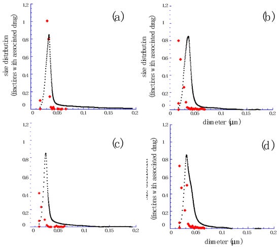 Size distribution plots of MAD015_QT (a), MAD025_QT (b), MAD015_RU (c) and MAD025_RU (d) elaborated from the SdFFF fractograms. Dots indicate the fractions containining QT or RU.