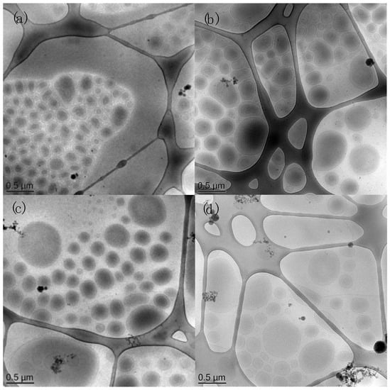 Cryo-TEM images of MAD015 (left column) and MAD025 (right column) referring to MAD015_QT (a) and MAD025_QT (b) and to MAD015_RU (c) and MAD025_RU (d).
