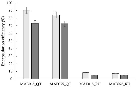The encapsulation of QT and RU into MAD015 and MAD025, expressed as percentage of the total amount used for the formulation, has been evaluated by UV spectroscopy and the stability of the drug content has been monitored 30 days after production, as displayed in Figure 4.