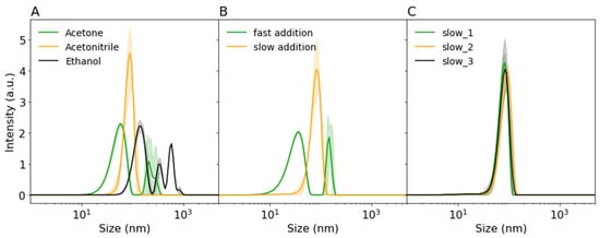 Dynamic light scattering (DLS) intensity distributions of (A) precipitated 12.5 mg/mL bovine serum albumin (BSA) by various non-solvents (1:4 water:acetonitirile (ACN)), (B) the influence of addition speed of ACN (fast = instant pipetting, slow = 0.5 mL/min) on nanoprecipitation of 25 mg/mL BSA, (C) repeatability of precipitation of 25 mg/mL BSA by slow addition (0.5 mL/min) of ACN. Shaded areas indicate standard deviation.