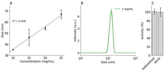 DLS intensity distributions of (A) nanoprecipitated BSA (10, 15, 20, 25 mg/mL) and (B) amylase (2 mg/mL) with ACN (5.5:1; 0.1 mL/min). (C) Normalized activity of redissolved nanoprecipitated amylase in PBS, compared to amylase stock. Error bars and shaded areas indicate standard deviation.