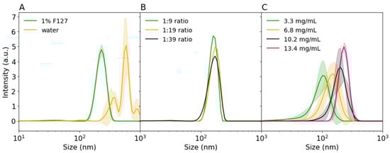 DLS intensity distributions of (A) precipitated 5002A PLGA in water of 1% F127 (1:9 ratio), (B) precipitated 5002 PLGA in different 1% F127 ACN:water ratios, (C) precipitated 5002A PLGA at various PLGA concentrations in 1% F127 (1:9 ratio). Shaded areas indicate standard deviation.