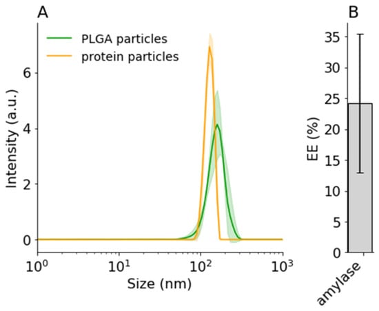 DLS intensity distribution of (A) precipitated amylase (5.5:1 ACN:water) and encapsulated amylase (5002A, 1:29, 1% F68). (B) Encapsulation efficiency of amylase. Error bars and shaded areas indicate standard deviation.