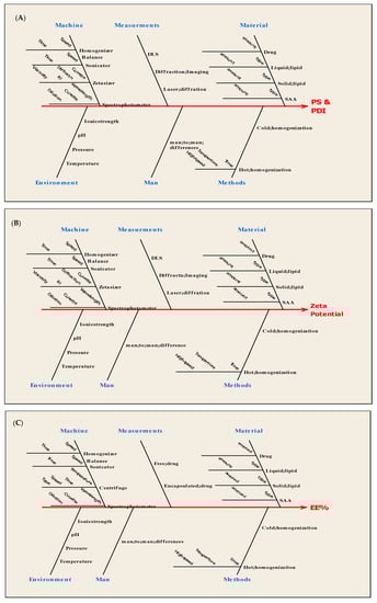 Ishikawa diagrams for different CQAs; (A) particle size (PS) and polydispersity index (PDI), (B) the zeta potential (ζ-pot), and (C) the entrapment efficiency (EE%).