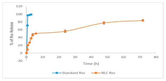 The NLC optimized formula was able to release the drug in a sustained manner, as compared to the standard Rsv (Figure 2). The optimized formula was able to sustain the release for up to 72 h. The drug on the surface of the vesicles resulted in an initial burst release which was followed by a sustained release pattern [].