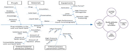 Ishikawa diagram showing the effects of critical material attributes (CMAs) and critical process parameters (CPPs) on the critical quality attributes (CQAs), for the optimization of a nanostructured lipid carrier (NLCs) formulation.