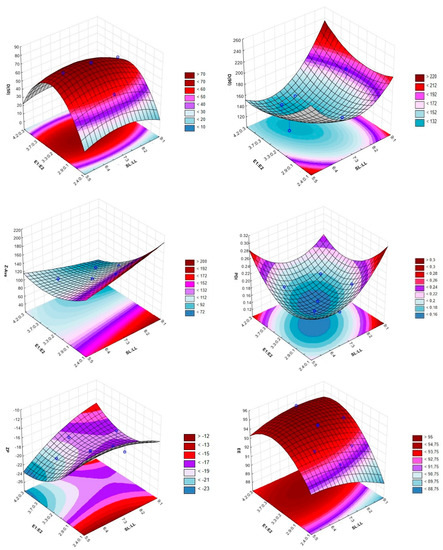 The 3D surface plots portraying the effect of the ratio between the solid and liquid lipids (SL:LL) and the two emulsifiers (E1:E2) on the size (D(50): 50% of particles with size equal to or lower than the given value, D(90): 90% of particles with size equal to or lower than the given value and Z-Ave: mean particle size), polydispersity index (PDI), zeta potential (ZP) and encapsulation efficiency (EE).