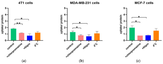 Uptake of PC/PG/CHOL 9:1:5 liposomes in different breast cancer cell lines in the presence of transport inhibitors or at 4 °C (normalized to cell protein). (a) Uptake per protein of liposomes in 4T1 cells; (b) uptake per protein of liposomes in MDA-MB-231 cells; (c) uptake per protein of liposomes in MCF-7 cells. * p < 0.05, ** p < 0.01.