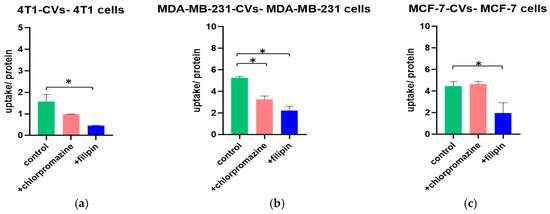 The uptake of 4T1-CVs and MCF-7-CVs seemed to be affected only in the presence of filipin, assuming that their internalization is active via the caveolin-dependent pathway. MDA-MB-231-CVs are also internalized actively, but their uptake was significantly lower in the presence of both transport inhibitors.