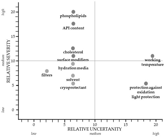 The influence of the collected material characteristics (CMAs) and the manufacturing process settings (CPPs) on the QTPP and CQAs were compared and rated on a 3-grade scale. After mathematical calculations on the provided data, the software generated a relative severity-relative uncertainty diagram (Figure 3).