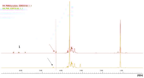 1H-NMR spectra of Pluronic® F68 (orange) and Pluronic® F68 diacrylate (red). The peaks identified with the number ‘1’ were formed after the activation of Pluronic F68. A slight peak shift was observed.