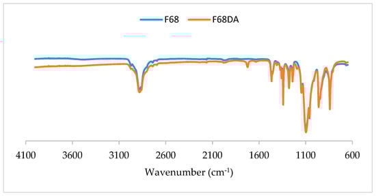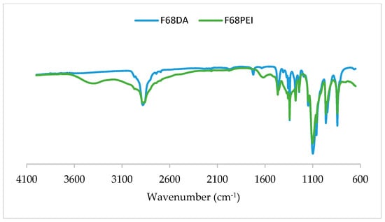 The FTIR spectra for Pluronic® F68 diacrylate and F68/PEI showed a band appearing in the latter spectrum, around 3400 cm−1, due to the amine N–H vibrations as indicated in Figure 4.