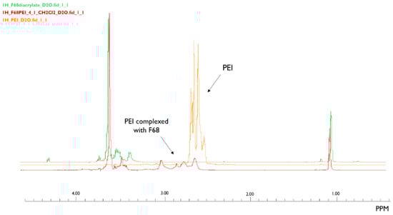 1H-NMR spectra of PEI (orange), Pluronic® F68 diacrylate complexed with PEI (red), and Pluronic® F68 diacrylate (green). Peaks in the F68/PEI spectrum are coincident with the peak observed in the PEI spectrum. The same peak is not visible in F68 diacrylate.