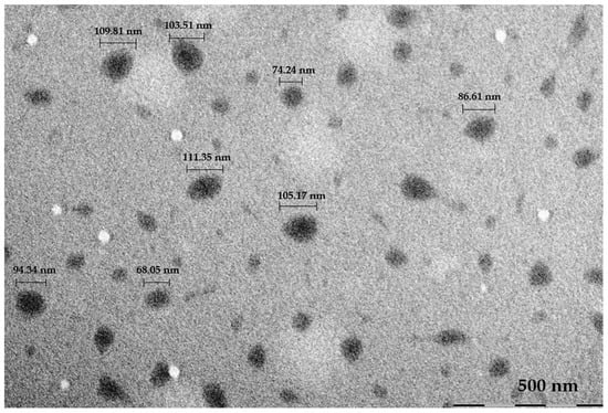 The morphology evaluation of the 2:1 ratio was performed by TEM (Figure 5). The nanoparticle size ranged from 68.05 to 111.35 nm. The nanoparticles appeared spherical in shape, with a slightly darker center and lighter shell.
