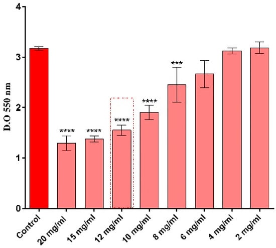 Graphical representation of cell viability after 24 h of treatment with 20 mg/mL, 15 mg/mL, 12 mg/mL, 10 mg/mL, 8 mg/mL, 6 mg/mL, 4 mg/mL and 2 mg/mL silk fibroin/poly(ethylene glycol) nanoparticles (SF/PEG NPs) + 5-fluorouracil (5FU) vs. an untreated sample, as revealed by the MTT assay. (*** p < 0.001, **** p < 0.0001).