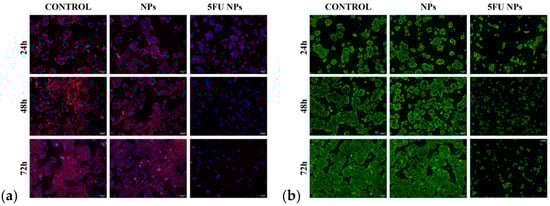 Furthermore, the HT-29 monolayers were stained with Calcein AM and EthD-1 for Live/Dead assay after 24 h, 48 h and 72 h of treatment with 12 mg/mL SF/PEG NPs ± 5FU. The fluorescence microscopy images obtained are presented in Figure 2b and show that cells did proliferate both in the control as well as in the sample treated with pristine SF/PEG NPs. More, cell viability between these two samples was similar during the experimental time frame. In contrast, when treated with 5FU-loaded SF/PEG NPs, HT-29 cells’ viability and proliferation potential dramatically decreased. The fluorescence microscopy images show that the culture did not display specific clusters as shown in the untreated control.