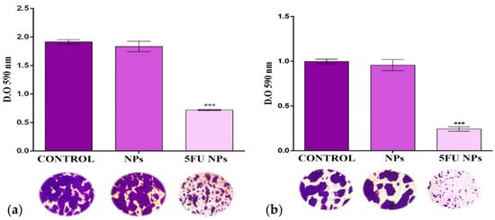 Graphical representation of the crystal violet staining of the (a) invasive HT-29 cells and (b) migrative HT-29 cells after 48 h of treatment with SF/PEG NPs ± 5FU. (*** p < 0.001).