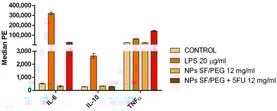 The proinflammatory potential of the simple or 5FU-loaded SF/PEG NPs was investigated using the RAW 264.7 cell line. Therefore, the RAW 264.7 cells were seeded at a density of 5 × 103 cells/well in 96-well culture plates, cultured 24 h and then deprived of FBS medium for an additional day. Afterward, the macrophages were treated with simple and 5FU-loaded SF/PEG NPs and LPS (20 mg/mL) for 24 h, the time point where the culture media were collected. The culture media samples were investigated by flow cytometry using a bead-based multiplex assay (BD CBA Inflammation Kit) designed for the analysis of the following cytokines’ protein levels: Interleukin-6 (IL-6), Interleukin-10 (IL-10), monocyte chemoattractant protein-1 (MCP-1), Interferon-γ (IFN-γ), tumor necrosis factor (TNF) and Interleukin-12p70 (IL-12p70). Briefly, 50 μL sample was incubated for 2 h at room temperature and darkness with 50 μL of IL-6, MCP-1, IFN-γ, TNF-α and IL-12p70 mixed capture beads and 50 μL inflammation PE detection reagent. Each sample was prepared in triplicate for statistical significance data analysis. A standard curve was prepared at the same time by adding in the control tubes 50 μL of inflammation standard dilutions instead of the samples. After a wash step, all tubes were analyzed in a Cytoflex (Beckman Coulter) flow cytometer using CytExpert Software (Beckman Coulter) for sample acquisition and data analysis.