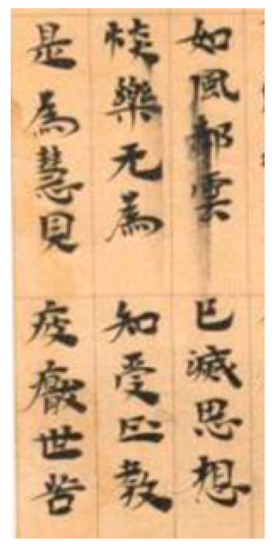 - Mao, Q. The Study on the Calligraphy of Transcribing Buddhism Scriptures of Dunhuang in the Northern Wei Dynasty; Suzhou University: Suzhou, China, 2002; p. 41. [Google Scholar]