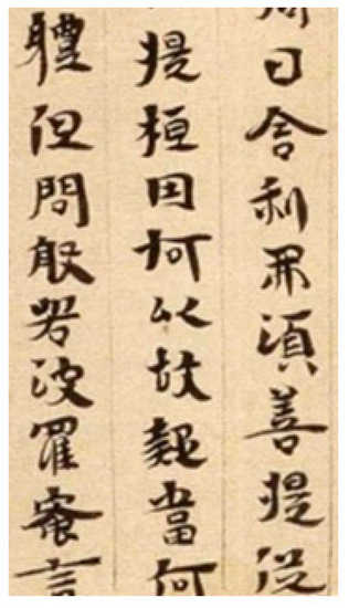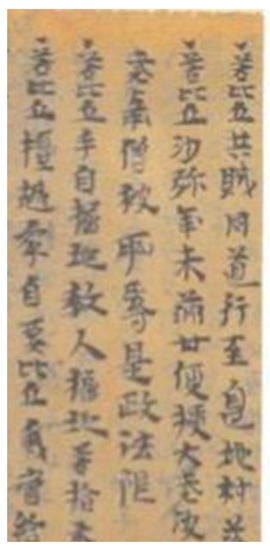 The Dunhuang posthumous papers are mainly regular script volumes. The authors of the Dunhuang posthumous papers typically chose a regular script when copying Buddhist sutras. The existence of the scribe style is the most distinctive feature of Dunhuang posthumous papers; that is, the historical relationship of the pen in the works of Dunhuang posthumous papers in the Wei-Jin period. The process of cursive script with official script gradually evolved into regular script is holographic performance. The fading of the meaning of official script is the concrete performance of the historical holography. The formation of regular script is holographic performance. In the same period, the performance of different styles of calligraphy is the complementary and different performance of horizontal holography. Figure 3 “Pi-Yu Scripture” is a Dunhuang sutra written in the Eastern Jin Dynasty (359 AD), and collected by Japan’s Nakamura Buji. It has the characteristics of an early Li script. The sharp pen is exposed, and the main pen is pressed heavily at the end to highlight the weight of the main pen. The character potential corresponds to the horizontal and vertical trend, which is obviously different from the horizontal trend of the li script.