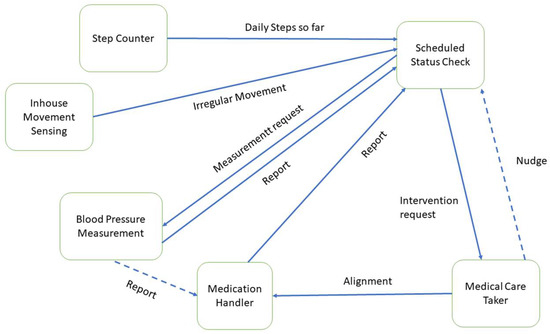 Human-centered socio-technical system development requires methodological support for articulation and documentation of stakeholder behavior and interests. An effective way to address the ‘who’ and ‘what’ issues (see Section 1) is to elicit and document value exchanges, as proposed by Value Network Analysis (VNA) [15]. The identification of value exchanges involves the specification of stakeholders and/or tasks and their interactions (see network nodes and directed edges in Figure 2) that are specific for a scenario (cf. [16]). For design-integrated engineering, the nodes encapsulate role- or task-specific behavior—they are also termed Behavior-encapsulating Entities (BeEs) [17]. Value exchanges can either be formal or informal (see solid and dotted lines in the home healthcare scenario addressed in Figure 2, respectively) to achieve a certain goal [15,16]. They correspond to transactions between BeEs and deliver some service or object as a result to the receiving BeE. Refinements of each BeE can be used in the digital twin model that serves as a (representational) baseline for design-integrated engineering [17], including specific patterns of situation-relevant behavior [18]. Putting behavior-based designs to practice involves validating models and monitoring the operation of a CPS [16,18].