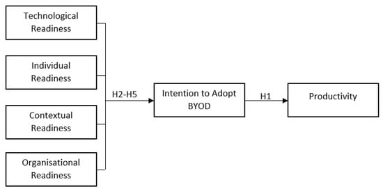 Behavioral intention to adopt BYOD is operationalized as the degree to which an individual has the urgency or tendency to adopt or refuse to adopt BYOD approaches. Behavior intention to adopt BYOD plays an important role in productivity improvement. Disengaging behavior or reluctance to adopt BYOD will lead to a negative impact on productivity improvement. As found out by [34], BYOD is no longer an option as many IT organizations turn to the concept of BYOD, thus, understanding the behavioral intention of users is very crucial to ensure the success of the transformation process. Similarly, [35,36] argue that BYOD implementation with related purposed has the capability to influence one’s productivity. Furthermore, BYOD also has the capability to enhance morale and increase engagement—thus closely related to productivity improvement [1,30]. Therefore, it can be hypothesized that:
