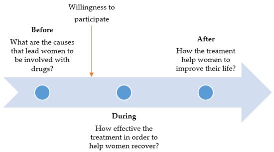 Figure 1 represents the whole focus of the study. The researcher determines whether the phases before, during, and after becoming a female drug user are interrelated. Hence, this study attempts to determine the factors affecting the tendency for drug abuse among Malay women. Furthermore, this study will also examine the category of admission among women clients, which will determine the intention and willingness to enter into and participate with treatment at the rehabilitation center. However, past studies revealed that the effectiveness of the treatment cannot rely on the program alone, but rather requires the willingness of the client to ensure the effectiveness of the treatment. According to [13], the willingness of the clients plays a crucial role as it will determine their level of participation during the recovery process. This is because, if the client voluntarily participates, they will have a better understanding of their addiction and may be more determined to be recover. The study conducted by [6] found that clients who voluntarily admit themselves into the center are more participative during the treatment process. Voluntary clients are more open to accept and participate during the treatment process, which will help them to reduce the tendency to relapse. One of the informants in the study also mentioned that the rehabilitation center can only provide programs for the clients, and at the end of the day, it fully depends on the individual to be ready and willing to make the changes. This proves that ensuring the client is willing to participate in treatment process is crucial. If the client is being forced to enroll at the center, they will have trouble adapting to the situation and this will affect the smoothness of the treatment process [14]. Moreover, [13] also stated that if a client is not willing to participate, they will lose the opportunity to understand their current situation and what the right treatment is that they need in order to recover. Finally, the effectiveness of the treatment program will depend on the client acknowledging how the program is able to help them to improve their productivity and quality of life after being released. This is because it is important to see how the program is able to help the clients to progress and survive in the real world.