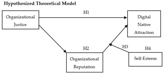 The present study found that organizational justice relates to organizational reputation [], while reputation has a strong influence on digital native attraction. In other words, organizational justice associates to organizational reputation, then the relationship anticipates an affect on digital native attraction. Thus, the present study anticipates that the relationship between organizational justice and digital native attraction is mediated by organizational reputation [,,]. Scholars have drawn out the mediator effect of organizational reputation, but have not examined the particular mechanisms, e.g., [,,,]. Thus, the hypothesis is developed: