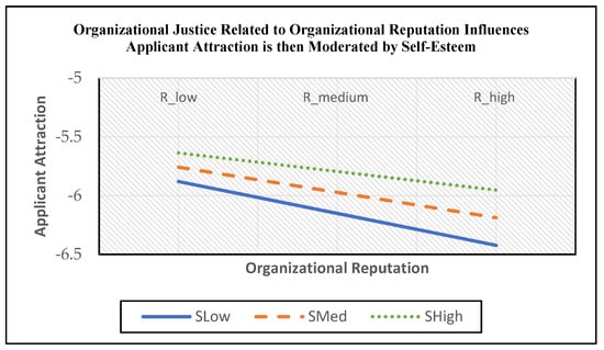The present study adopted a model called the moderated mediation model, wherein the mediator (organizational reputation) and the moderator (self-esteem) are tested simultaneously with an independent variable (organizational justice) and a dependent variable (digital native attraction). To perform the test, four procedures have to be followed. The first step is to assess the relationship of organizational justice with organizational reputation. The present study found no straddle (0) when referring to the CI bias correlation (LL = 0.911, UL = 1.016); thus, the result is significant [,]. The second step is the assessment of the relationship between organizational reputation and digital native attraction, and the results were also significant for no straddle (0) (LL = 0.684, UL = 1.045). The second last step is to assess the moderator of the present study, as the direct relationship of organizational justice was shown to be significant by referring to (b2i = −0.297, t = 6.731) (LL = 0.211, UL = 0.385). Previous assessments have stated that the eligibility of the present study depends on the last step. The final step is to test the interaction of self-esteem and organizational reputation to determine the relationship between organizational justice and digital native interaction. The results demonstrate a significant relationship (b3i = −0.105, t = −2.196) (LL = −0.200, UL = −0.011); however, the impact is negative (p < 0.05) (see Table 1).