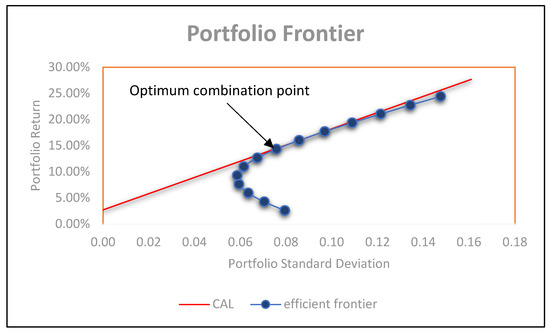 As a result, the efficient frontier for the two-asset portfolio was derived as presented in Figure 1, which shows the efficient frontier line and CAL plotted on the same graph.