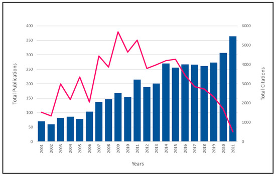 Examining the documents according to the year of publication enables the researcher to track the development and soaring interest in the research topic through time [8]. With a total of 364 documents produced, 2021 saw the most output—while 2002 saw the lowest, with just 60 publications. The number of documents published throughout the study period showed an increasing trend within the last 20 years, as seen in Figure 3. However, the number of citations illustrated by the line showed a decreasing trend. Due to the short period that had passed since their publication, the number of citations per publication was highest for documents released in 2005 (43.04 citations per publication) and lowest for those published in 2020 (1.42 citations per publication).
