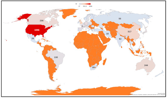 The release of the collected materials involved researchers from 114 different nations. With a total of 1044 documents (26.44%), the United States of America came out on top—followed by the United Kingdom (470; 11.88%), China (317; 8.01% ), Australia (244; 6.17%), and Canada (236; 5.97%). In Figure 4, the map displays 114 nations arranged into five distinct groups—each of which is coloured differently.