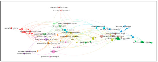 A network visualisation map for the co-citation analysis of journals with a minimum of 50 citations is shown in Figure 5 below. PLOS One was frequently co-cited by other journals, showing the maximum number of linking lines from other journals. Additionally, this publication had the largest circle size, indicating that it had the most citations for research on ageing populations.