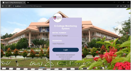 The application was developed using PHP programming language, adopting the Laragon framework. The following figures show print screens of the user interfaces for the E-College Monitoring System. The following Figure 3 illustrates the login page of the system.
