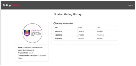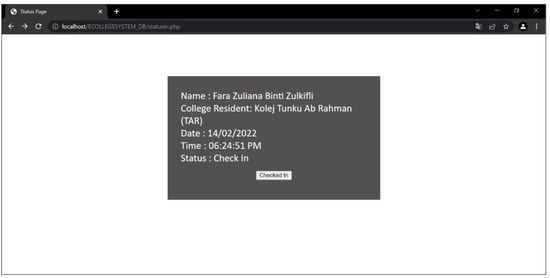 The following Figure 6 indicates students’ outing history. Students can view their outing history in this page. This page will display their in and our time. The check in and check out function is shown in Figure 7. Through this module, staffs are able to monitor the students.