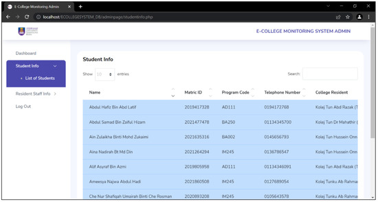 This system is not only beneficial and useful to the students but also to the management. Through this system, management can monitor the students as shown in Figure 8. Apart from that, by using this e-College Monitoring System, the managements especially the College Residents Staff (CSR) can view the details of the students including their contact number as illustrated in Figure 9.