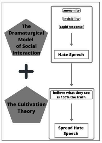 Both models and theories come from different fields as The Dramaturgical Model of Social Interaction comes from psychology and the Cultivation theory is a classic theory from the communication field; it may seem to not be related to each other but in this study, hate speech is in the form of social interaction online and what media has been telling us. In online interaction, people can say what they want without any filter or gatekeeper, either way their own posts or tweets or their comments on some other individual posts. In this way, the whole world can actually react to each other either in a good or bad way; it is not an issue if good things spread all over the Internet, but we are concerned that bad things, such as hate speeches, will have a negative impact on other people who presume what they see is 100 percent true and real; they will always be impacted by what they see on social media, spreading pessimism without questioning whether it is true or not; this could be a viral disease or cancer for the virtual world. Figure 1 shows the relation between The Dramaturgical Model of Social Interaction [] and the Cultivation theory [].